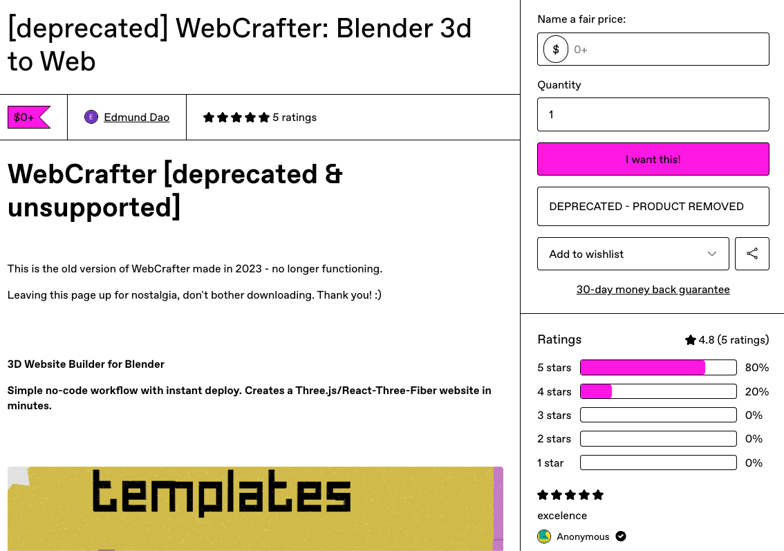 The toolkit to go from blender to 3D website in minutes. Unlimited projects, free live deployment, multiple professional templates, and all future updates!